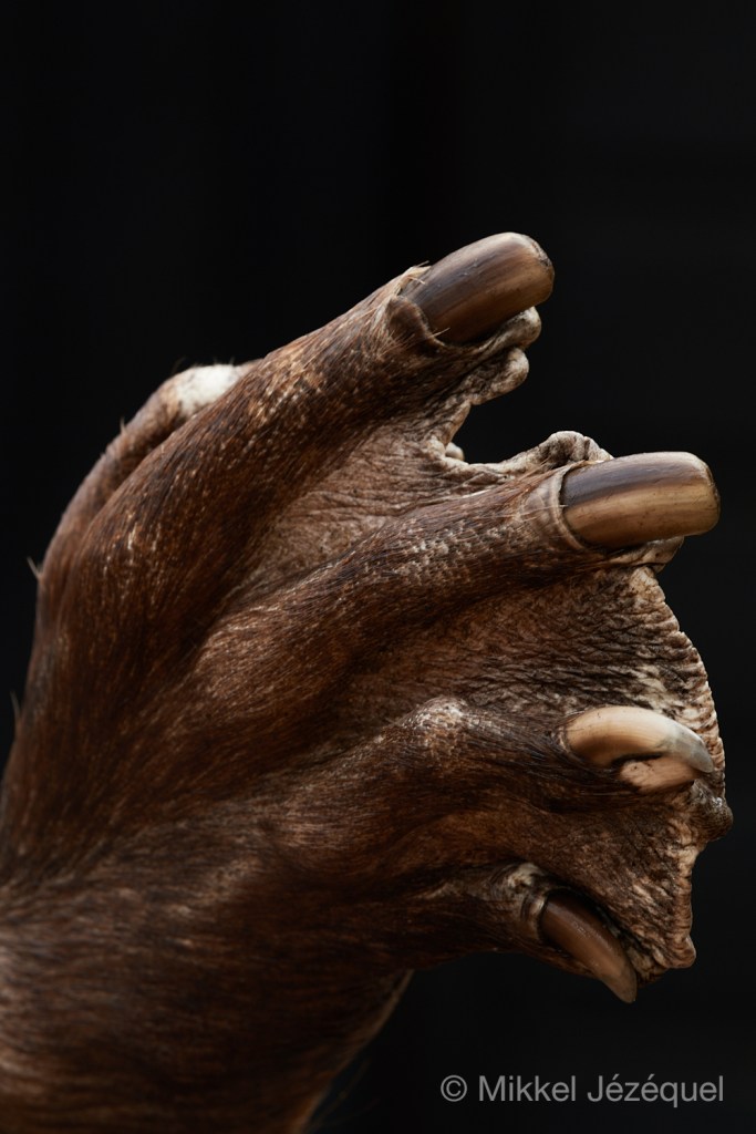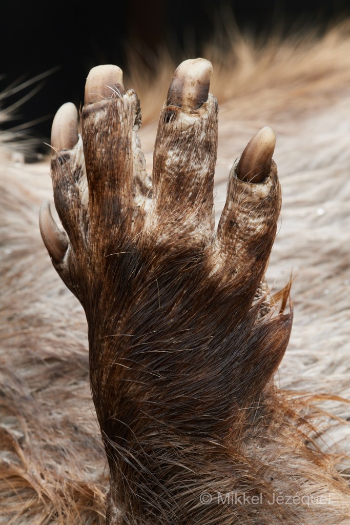 Her ser du nærbilleder af bæverens fødder og poter. Til venstre er det bæverens bagfod, og du kan tydeligt se, at den har svømmehud mellem tæerne. Bæveren er godt tilpasset livet i vandet.