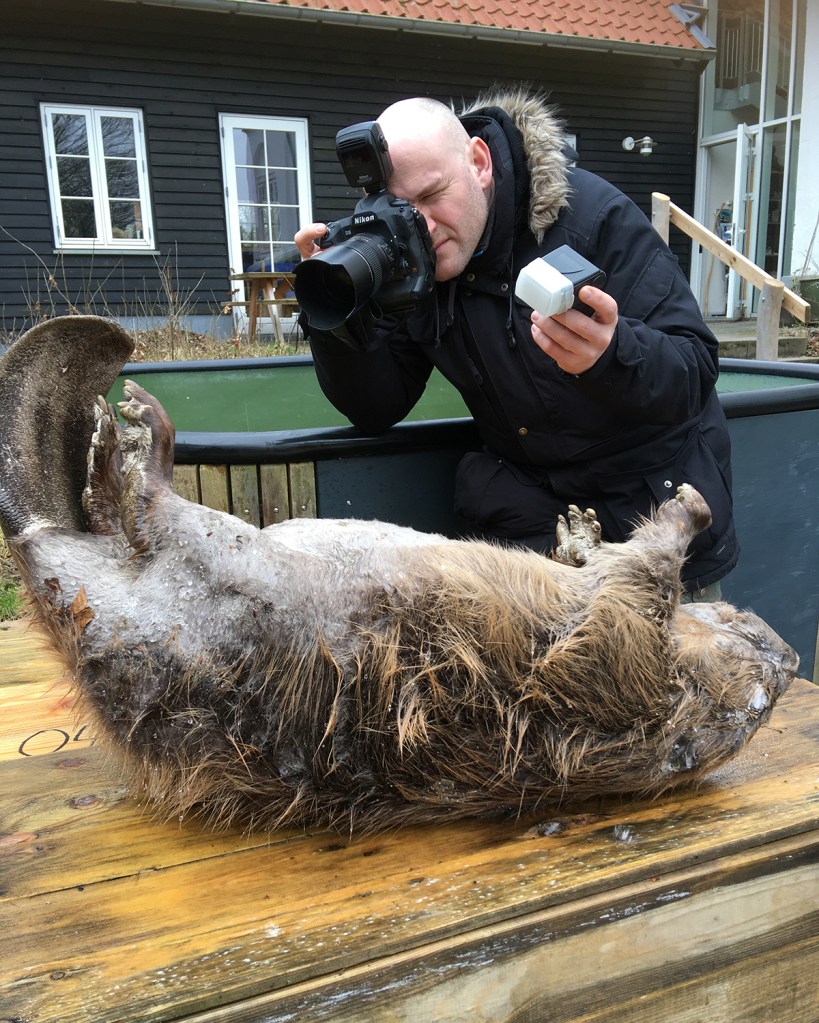 Bæveren var en han, som har været i dyreparken, men som desværre måtte aflives. Det var en lidt voldsom oplevelse sådan at stå med det døde dyr foran os, men vi tænker på, at denne bæver i døden er med til at fortælle bæverens historie og lære os alle mere om dyrene i lang tid fremad, når billederne trykkes i bogen.