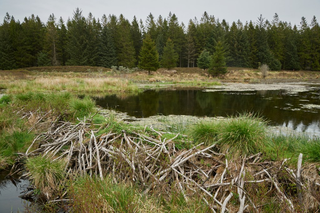Her ser du en bæverdæmning. Før bæveren kom var der kun en lillebitte grøft i dette område, der var groet helt til. Dæmningen her stemmer vandet op, og det har dannet den store sø, hvor der i dag lever masser af fisk, og hvor det summer af insekter. Bæveren har nu vand nok i søen til at kunne etablere sig bo, svømme rundt, spise vandplanter og lave vinterforråd.