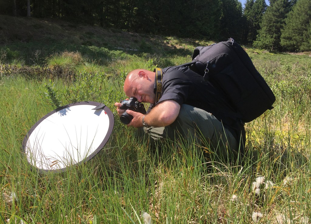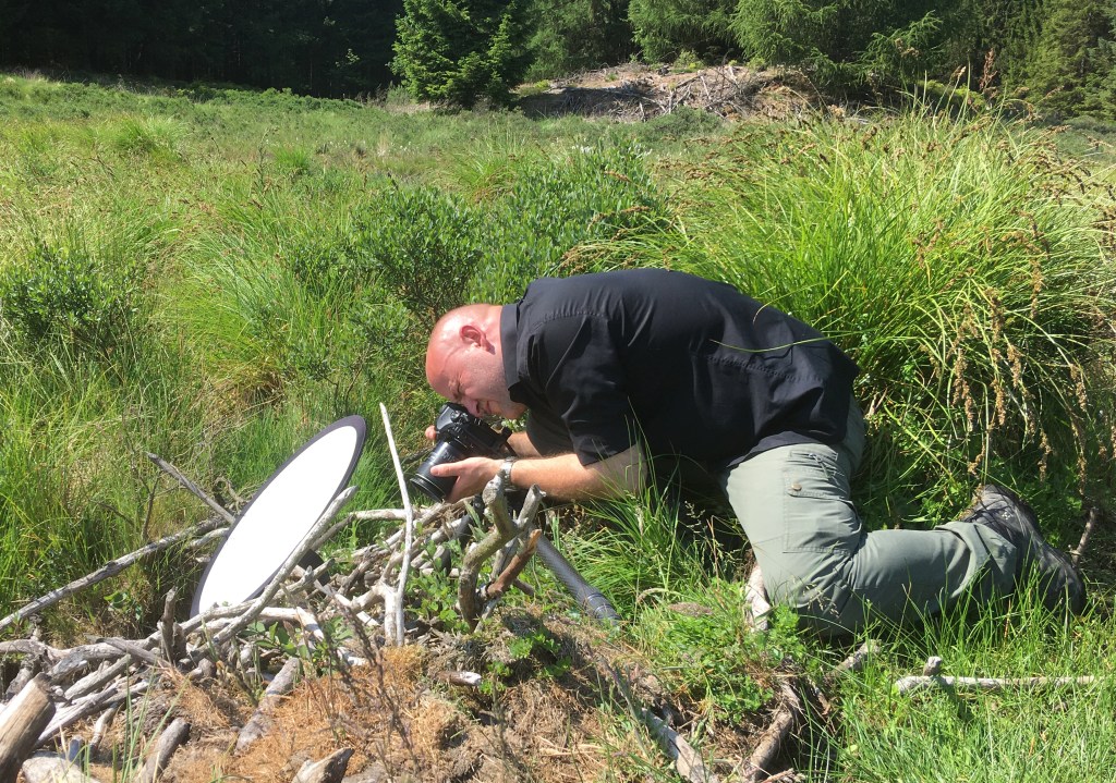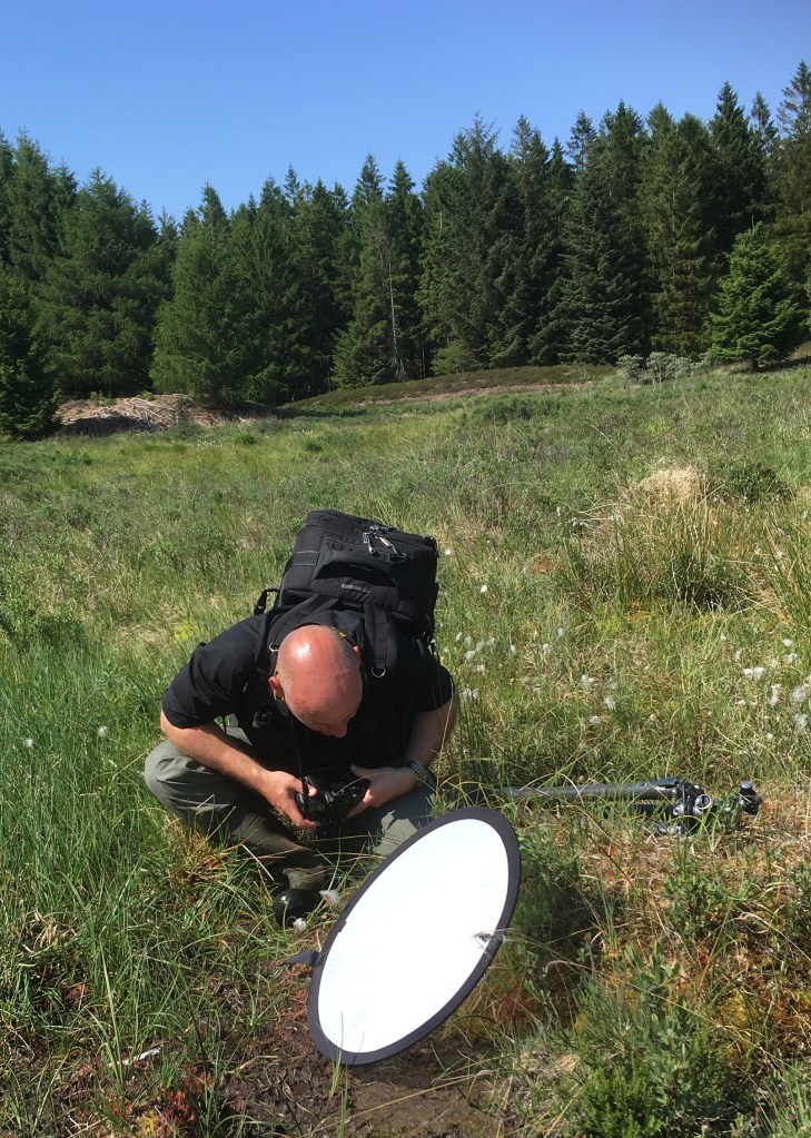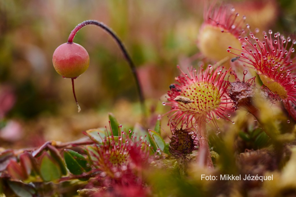 Fotograf Mikkel Jézéquel på arbejde med makro-fotografering af planter i bæverområdet.Tranebær og den kødædende plante soldug side om side i bæverens vådområde i Klosterheden.